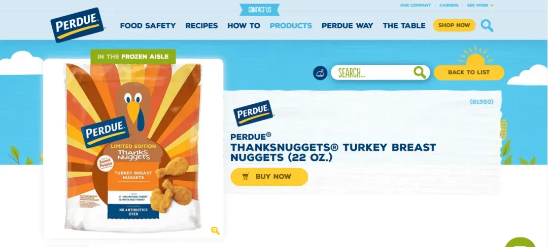Perdue Chicken是一家主营鸡肉销售的品牌,他们在2020年美国感恩节期间推出了节日新品ThanksNuggets,还别出心裁给它们换上了感恩节主题的新包装并且限量发售。由于产品限量且热度很高,Perdue Chicken的ThanksNuggets一上线,三分钟便被全部抢光,创造了一个小的销售爆点。