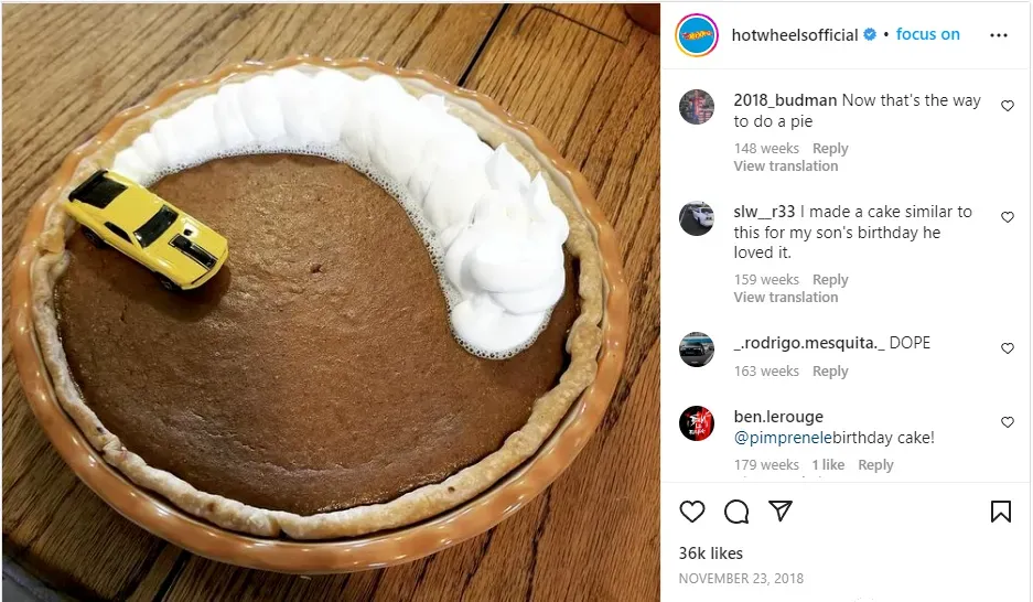 比如,玩具公司 HOT WHEELS,就在INS上发布了关于美国感恩节的帖子,对南瓜派进行了创新,整体形状做成了与产品相关联的汽车跑道,同时将其产品玩具汽车融合进南瓜派中,用奶油做出尾气的形状,创意十足的同时又能让人一下子就明白这是玩具汽车在感恩节的帖子,也因此获得了粉丝3.6万点赞。