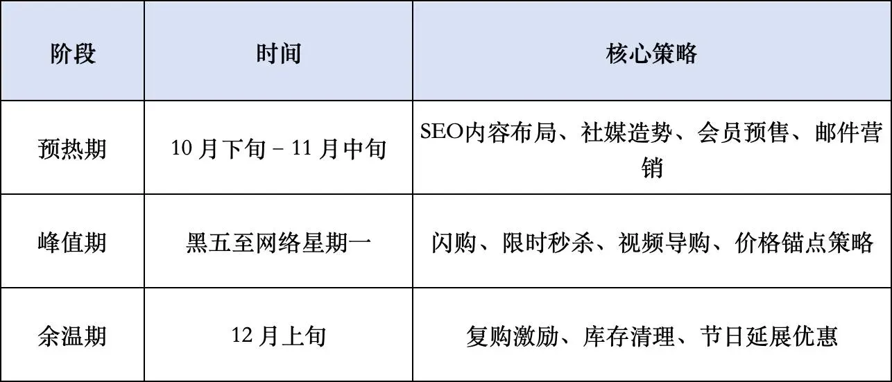 这意味着,商家若等到黑五当天才上架促销,实际上已错失超过一半的流量窗口。提前布局需包括以下 3 个阶段: