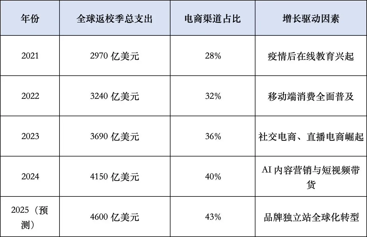 回顾过去五年,我们可以清晰地看到返校季消费在全球范围内的变化轨迹: