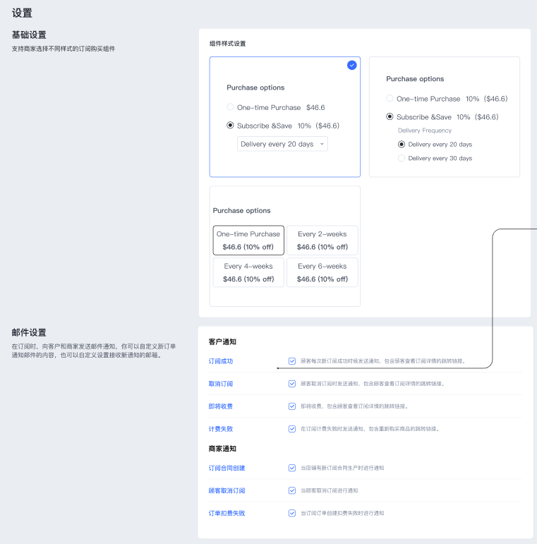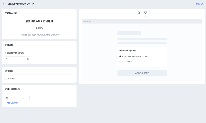 商家可根据不同商品设置对应的订阅购买选项,包括设置订阅周期次数、订阅折扣(可通过订阅额外折扣吸引顾客进行订阅购买)、订阅周期间隔频率(根据店铺商品类型设置合适的购买频率)