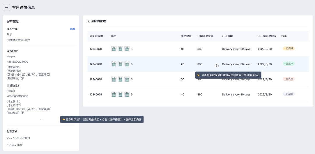 可查看店铺已订阅用户基本信息(名称、收货地址、付款方式),查看用户购买的订阅合同。