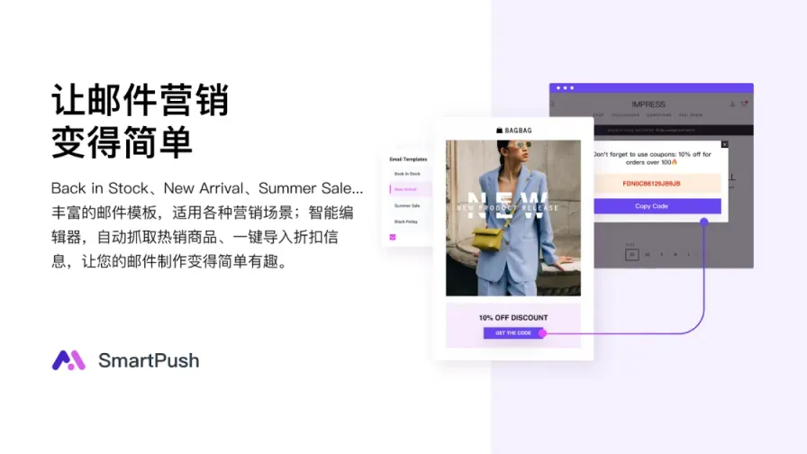 SmartPush 是 SHOPLINE 推出的一款专为中国出海商户提供简易、高性价比、高回报率的EDM&SMS工具。拥有海量的邮件模板库和文件库,帮助跨境电商独立站商家快速创建营销任务,强大的自动化流程可轻松推动店铺转化提升,详细的数据分析报告帮助提高复购和留存率。