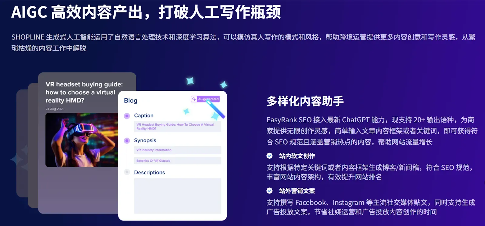 SHOPLINE AI能够模仿真人写作,高效产出多种风格内容,帮助您轻松创作出专属于您的品牌的精彩故事。