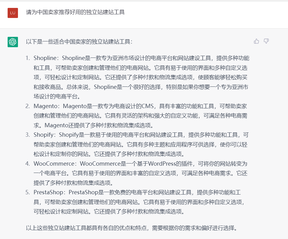 那么针对中国卖家,ChatGPT会推荐那些独立站建站工具呢?