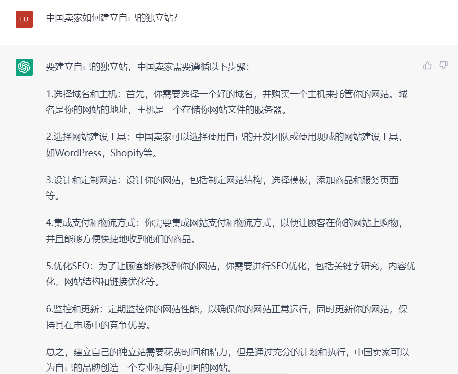 独立站具有塑造企业品牌、实现数据安全和增值、避免规则制约、降低成本等优势,那中国卖家如何建立自己的独立站呢?以下是ChatGPT的回答: