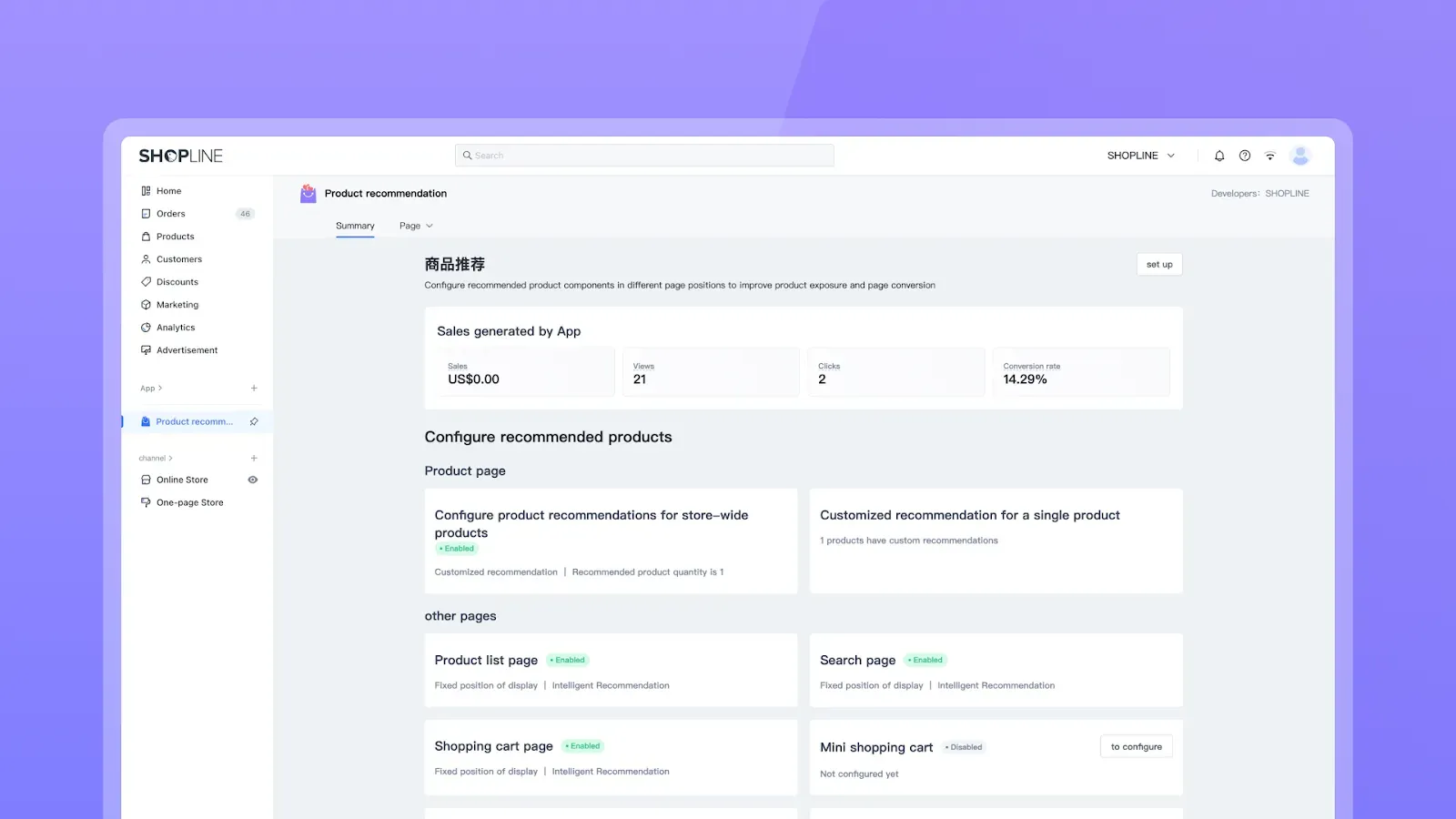 独立站能够提供个性化推荐和优质的购物体验,从而增强用户粘性。通过分析消费者的购买行为,商家可以优化产品展示和推荐策略,提升用户满意度和复购率。SHOPLINE的自研插件商品推荐,利用强大的AI引擎,为店铺设置更符合客户画像的商品推荐组件。这种智能化的商品推荐不仅提升了用户体验,还有助于提升客单价和销售额,为商家带来更高的转化率和利润空间。