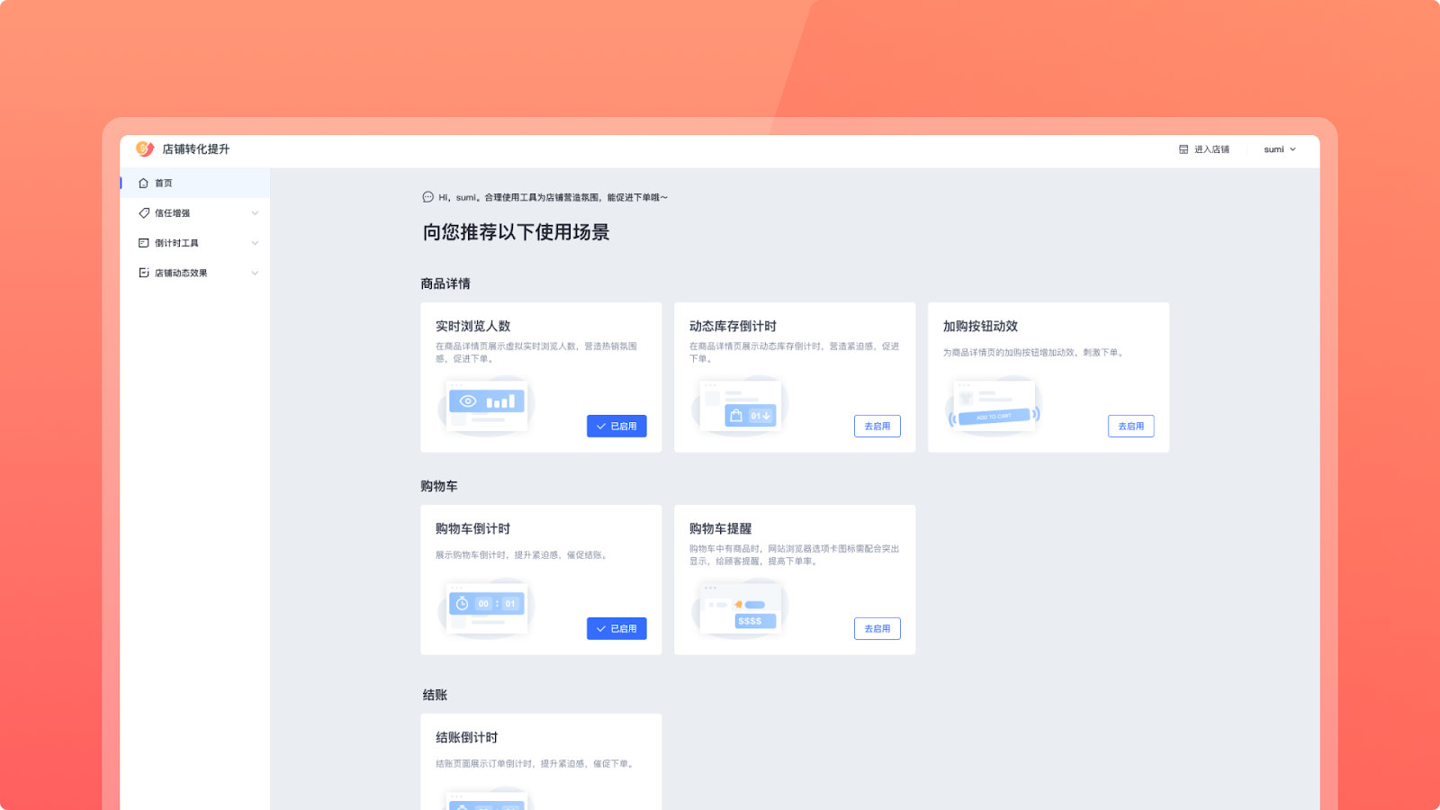 在产品页面上使用倒计时器能够有效推动消费者的购买决策。提前发布促销信息并设置专用登陆页面,激发用户的期待值。借助SHOPLINE的插件,如店铺转化提升,商家可以实现动态库存、购物车倒计时和订单倒计时,营造稀缺和紧张的购物氛围,从而促进下单,提升转化率。