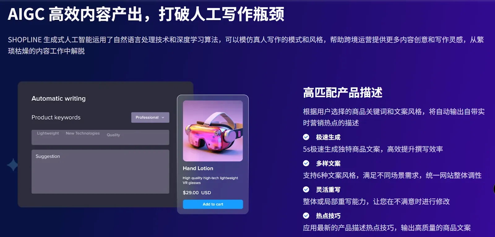 SHOPLINE AI能够模仿真人写作风格,高效产出高质量文案,根据用户搜索关键词和产品文案风格,自动加入营销热点词,极速生成高匹配产品描述。