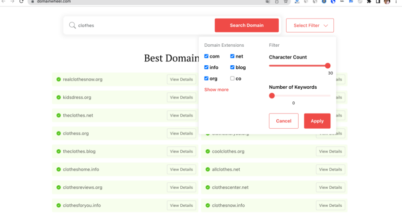 比如你想做一个卖衣服的跨境电商独立站,那么可以输入关键词‘clothes’,可以选择.com网站后缀,点击‘Search Domain’便可以找到很多还没有注册的域名,有合适的可以通过域名注册商阿里云、GoDaddy、Namesilo等进行注册,这些是比较知名的域名服务商。