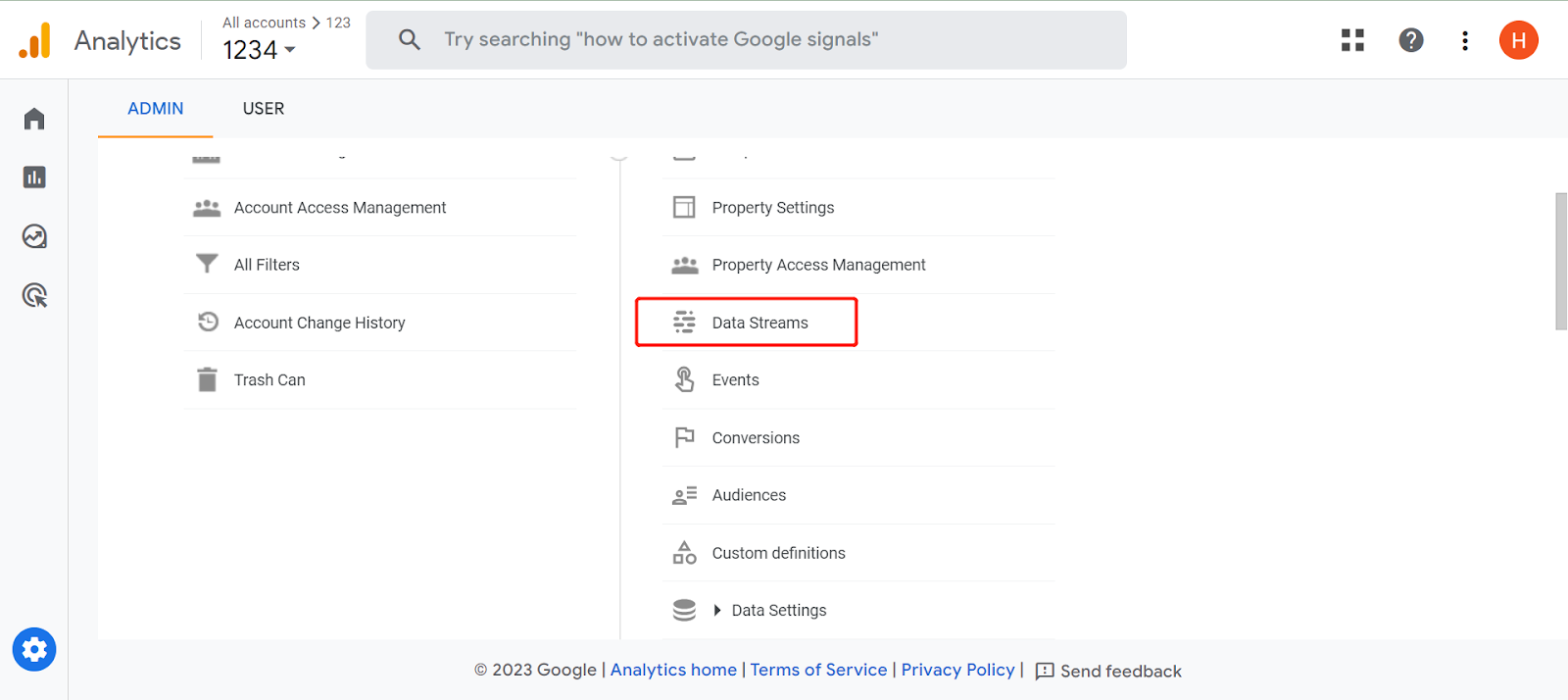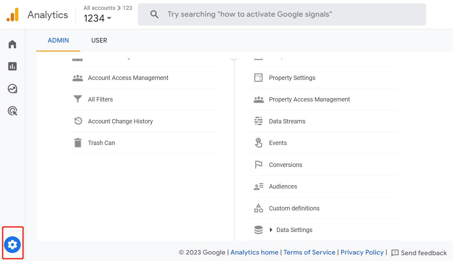 第一步:进入GA后台,选择左下角管理Setting选项