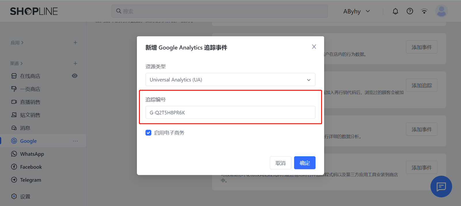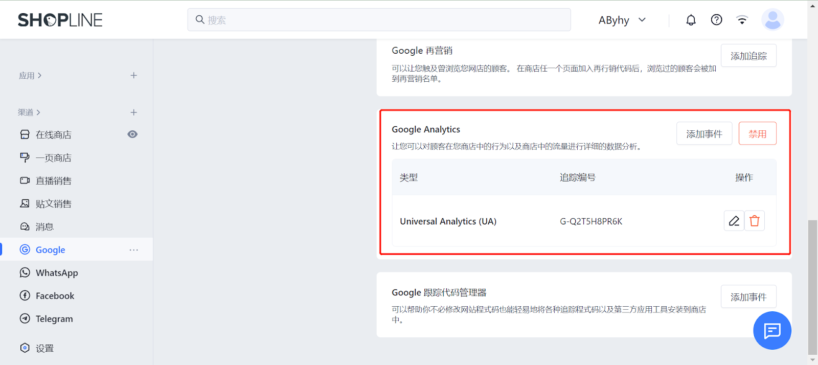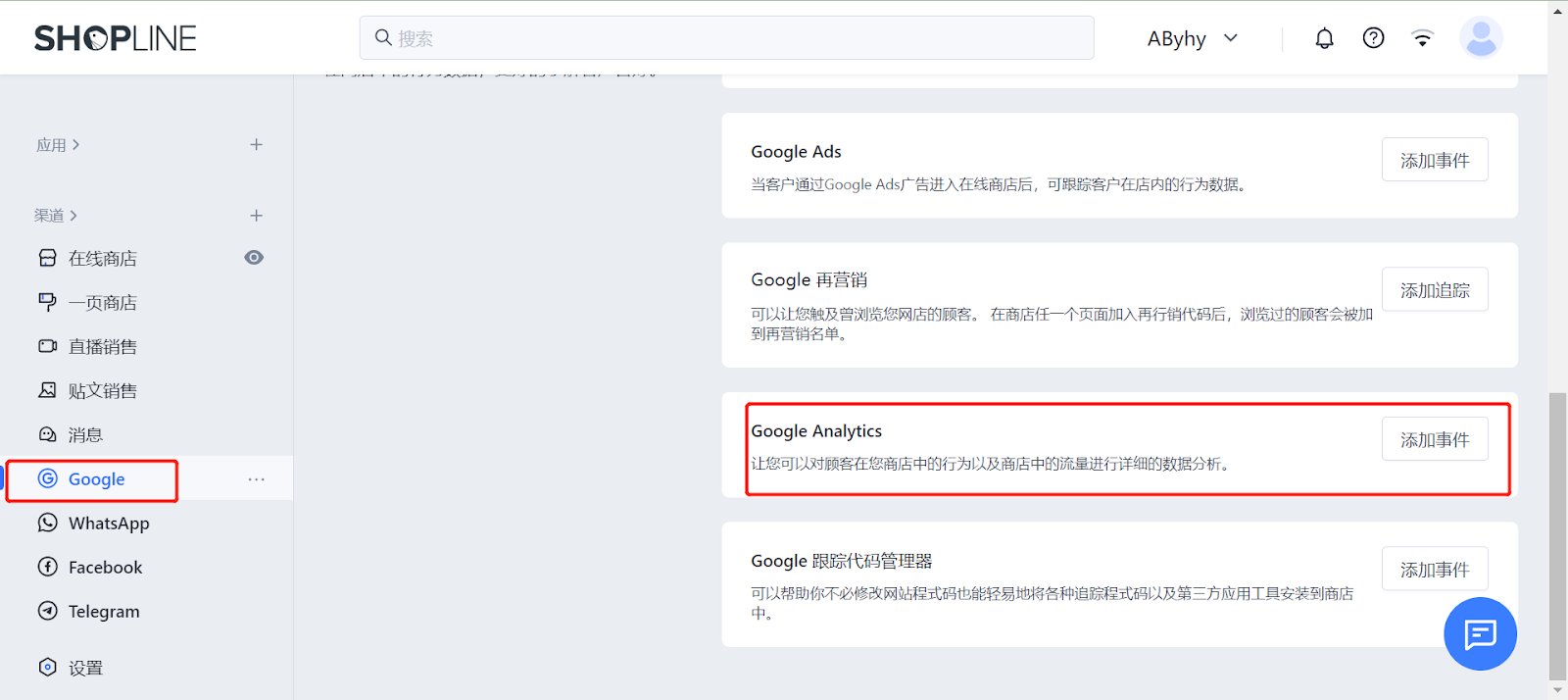 第五步:回到SHOPLINE商店后台,选择「Google」-「Google Analytics」-「添加事件」
