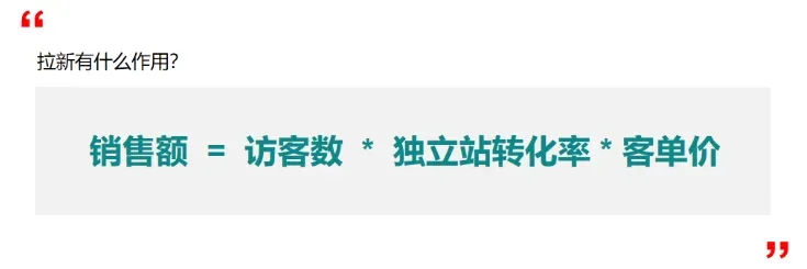 销售额=访客数*全店转化率*客单价,独立站领域中影响销售额的各个因素简而言之便是拉新复购,所有的销售额来源便是建立在这两个的基础上,无拉新就无持续性增长的转化!