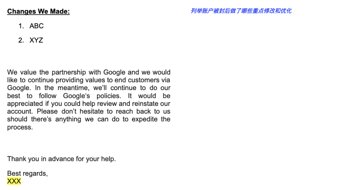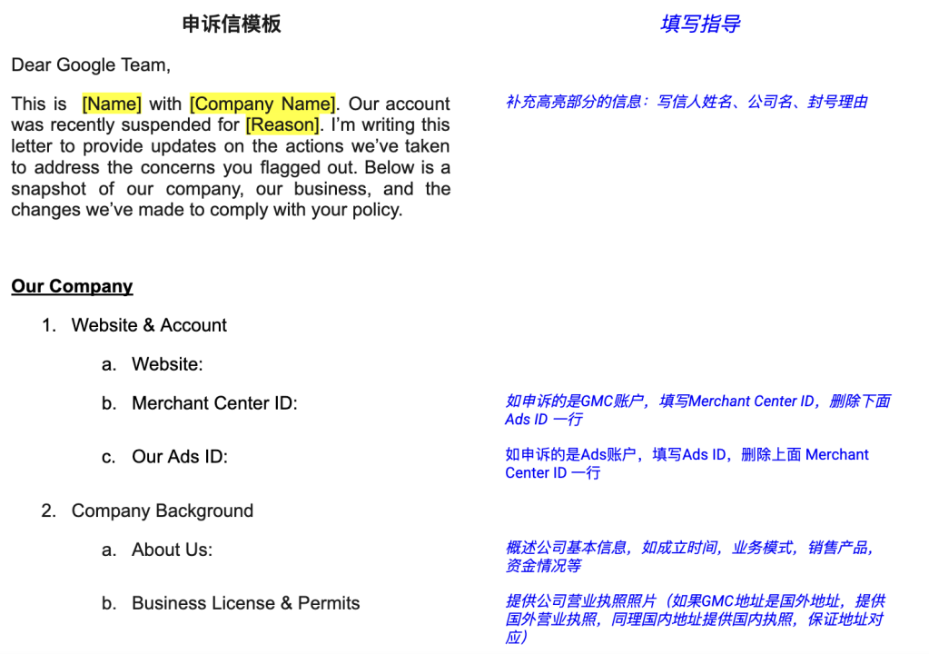 申诉信是为了给审核小组提供更全面的公司信息,帮助其综合考量决定是否解封账户。根据模版写完申诉信后发送到谷歌策略组的邮箱等待审核。