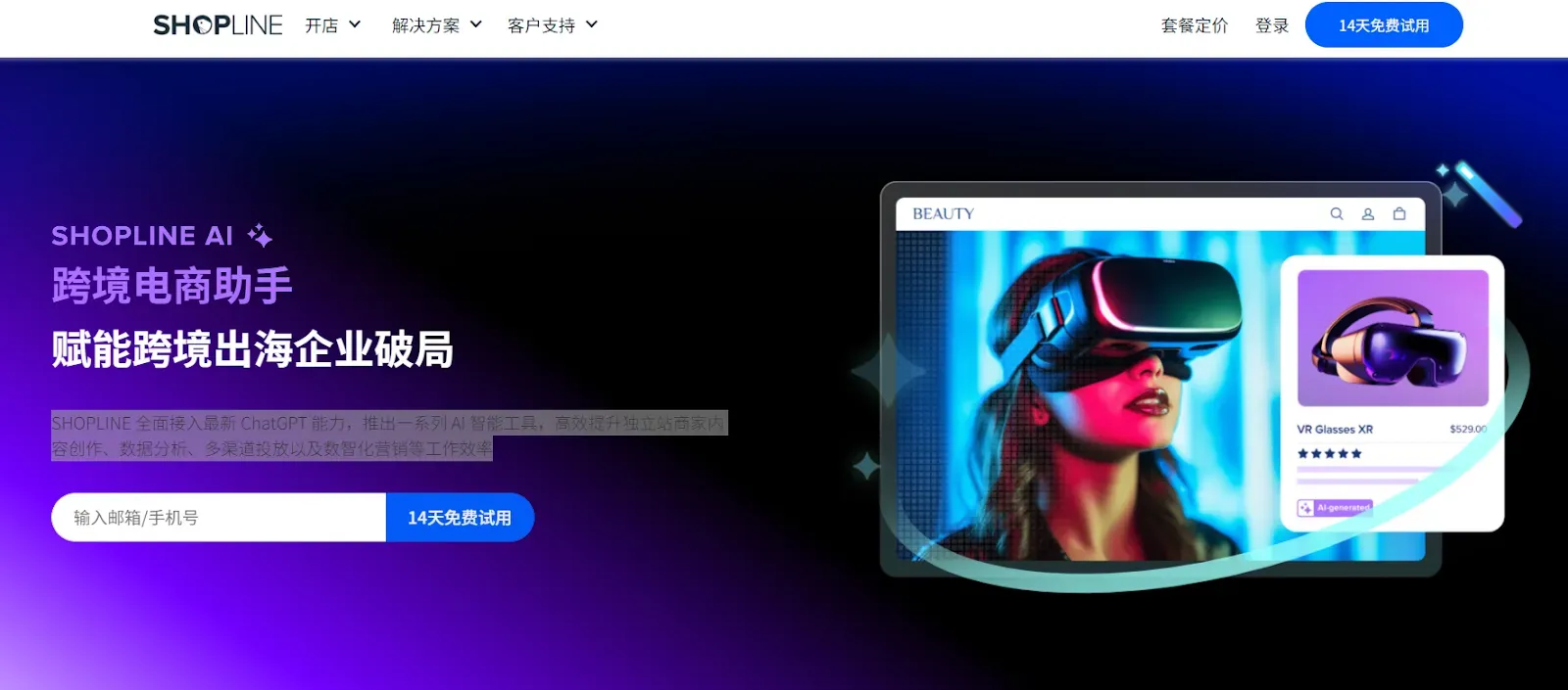 SHOPLINE 全面接入最新 ChatGPT 能力,推出一系列 AI 智能工具,使用SHOPLINE AI,高效提升独立站商家内容创作、数据分析、多渠道投放以及数智化营销等工作效率!