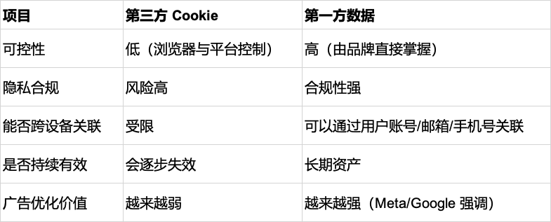 因此行业普遍认为:后 Cookie 时代,第一方数据是唯一能够持续有效支撑广告优化的信号。