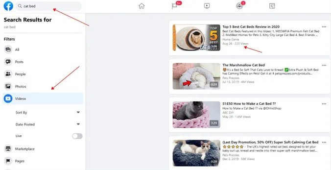 只要在Facebook搜索栏中输入对应的英文关键词,然后在左侧单击“Videos”就可以观看视频。