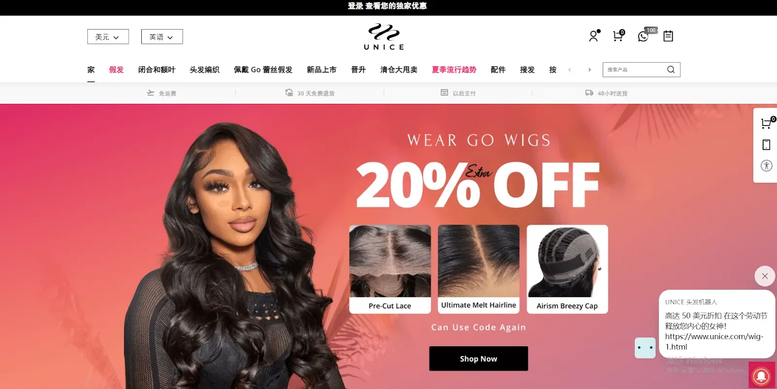 打开网站,呈现眼前的是醒目的主题设计与戴着假发的女模特,在整体造型和妆容的加持下,让假发佩戴效果更能被消费者直观看到,另外,在主页会有轮播图片展示,配合重点节日营销,推出主要产品类目,增加消费者的购买欲望。