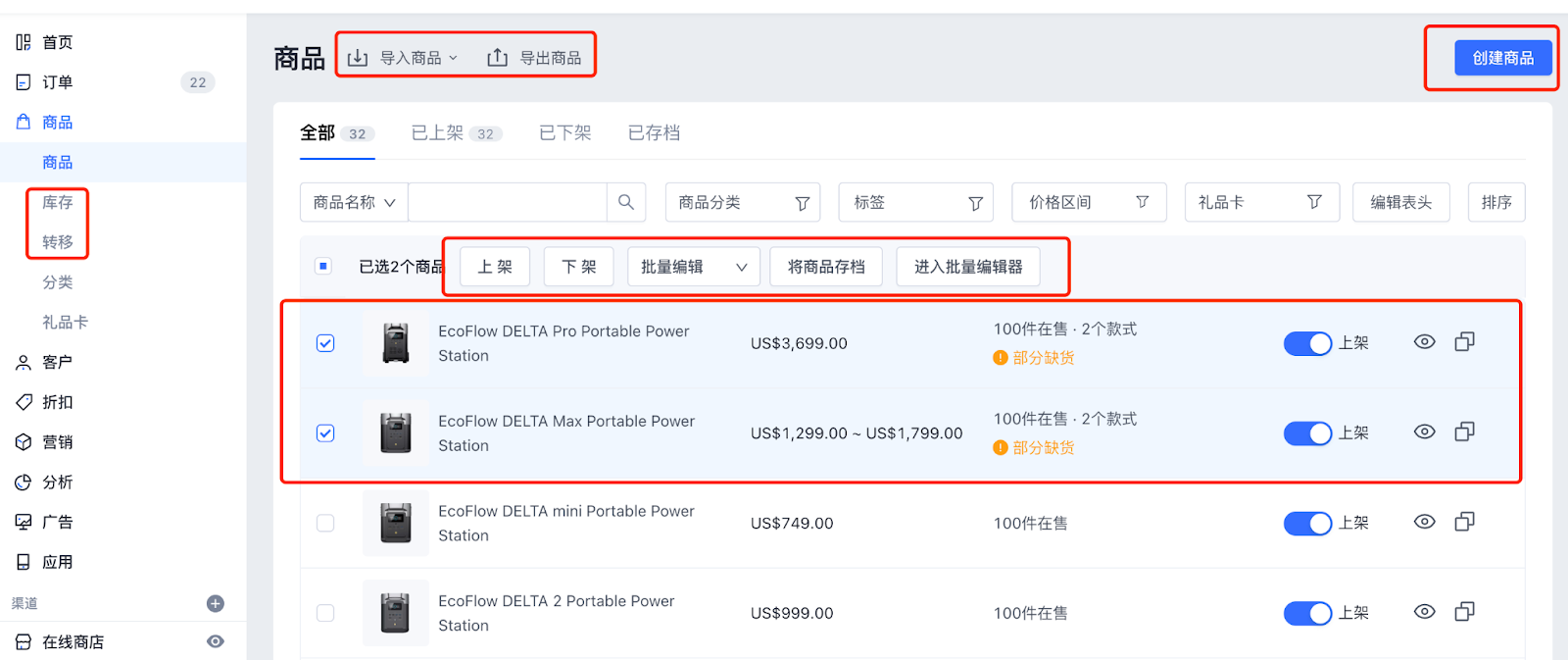 在产品列表页面选中某几个或者全部产品,在上方就会出现上架、下架、批量编辑、商品存档和批量编辑器按钮,可以对选中的产品进行批量操作。在左侧边栏的库存和转移是Shopline内置的库存管理系统。分类是Shopline的产品分类管理。