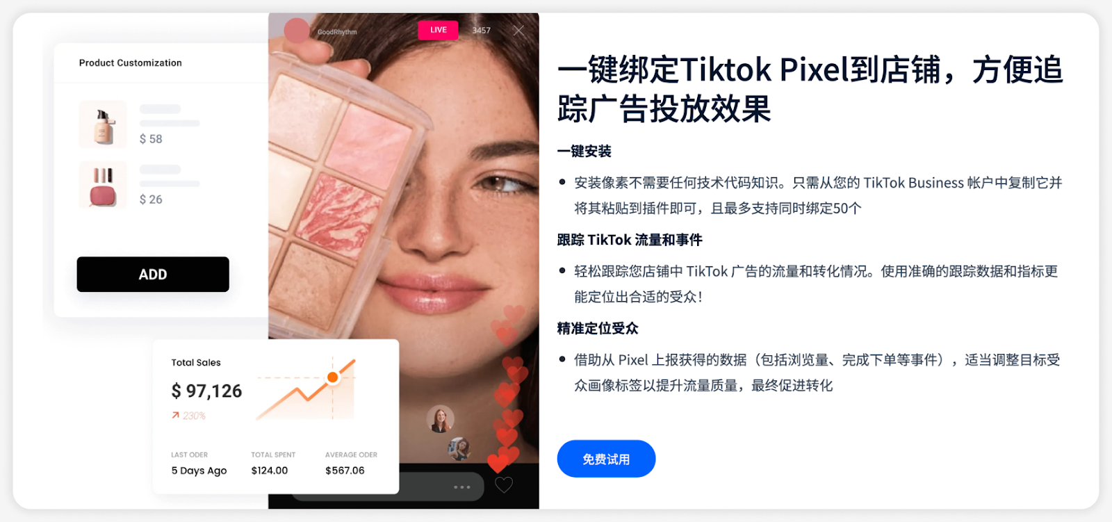利用TikTok的数据分析工具,商家可以跟踪直播的观看人数、互动率、转化率等关键指标,评估直播的效果。通过分析这些数据,商家可以了解哪些内容最受欢迎,哪些环节需要改进,从而优化后续的直播策略。SHOPLINE支持一键绑定Tiktok Pixel到店铺,借助从 Pixel 上报获得的数据(包括浏览量、完成下单等事件),适当调整目标受众画像标签以提升流量质量,最终促进转化。