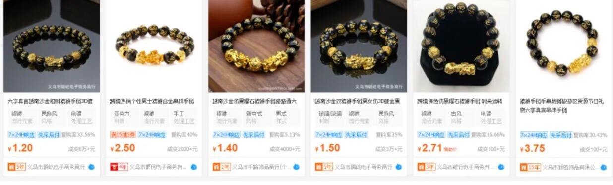 Buddha Stones 主要售卖佛教主题的珠宝饰品,其中最具代表性的产品是貔貅手串。在中国 1688 平台上,同款产品的批发价格仅为 2 元人民币左右。