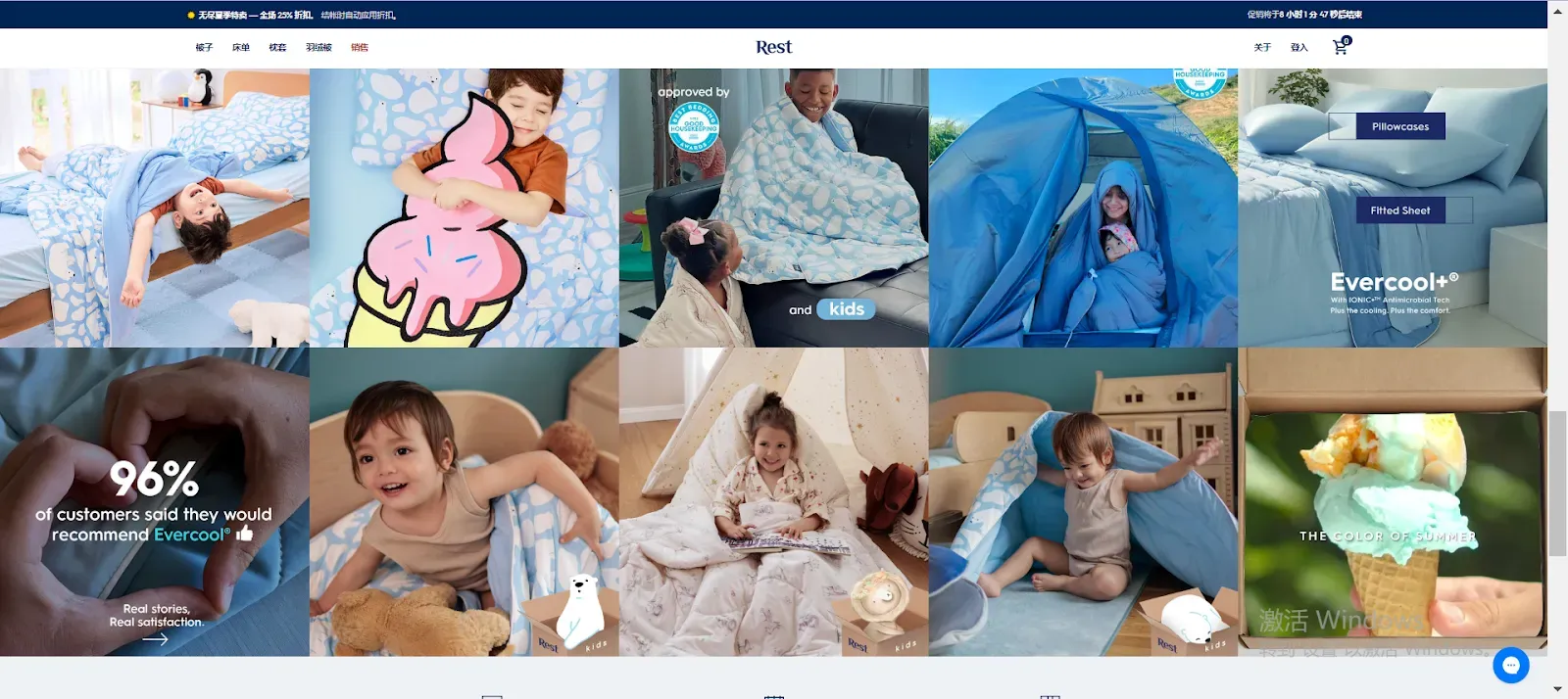 对于儿童来说,床上用品的品质非常重要。家长通常会选择更适合儿童肤质的产品。为了向家长传达这一信息,Rest家居的网页中出现了许多以儿童和产品为主体的合照。这种设计潜移默化地告诉家长,Rest的产品非常适合您家的孩子使用。