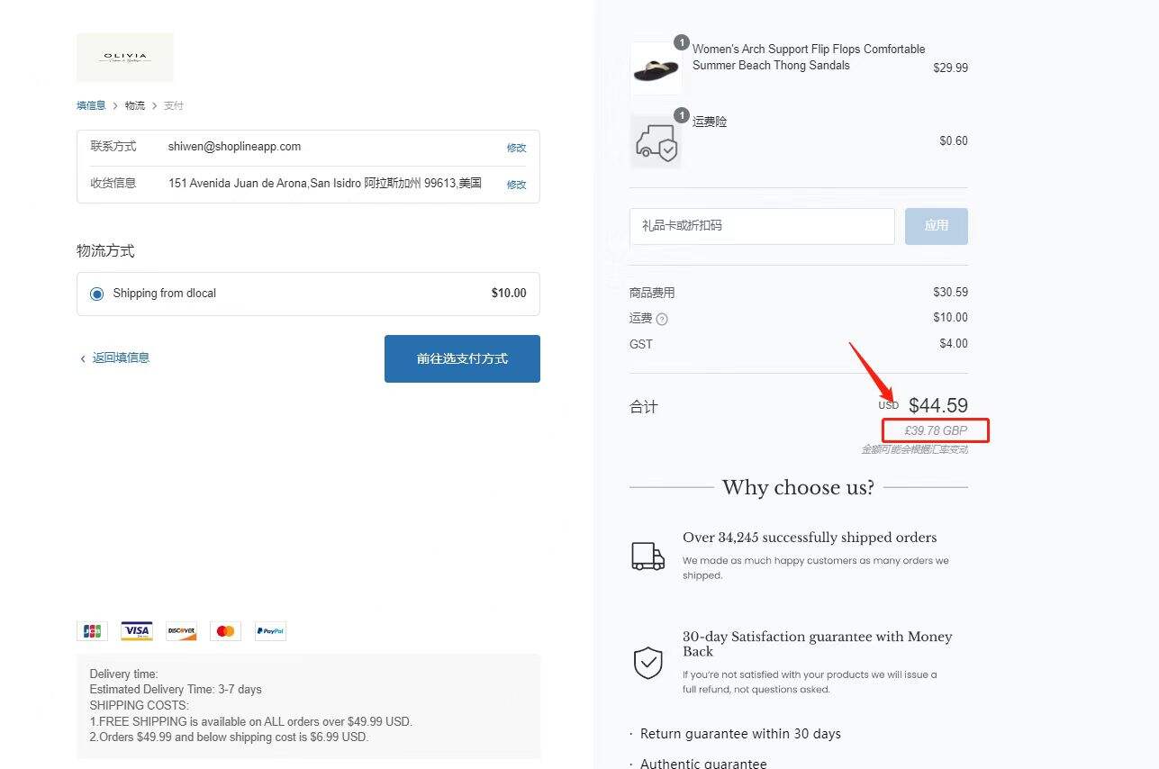 例如店铺结算货币为美金,若英国的一个顾客在店铺内购买商品,在结账页面可以看到两种货币,英镑和美元,但最终结算的时候还是以美元币种结算