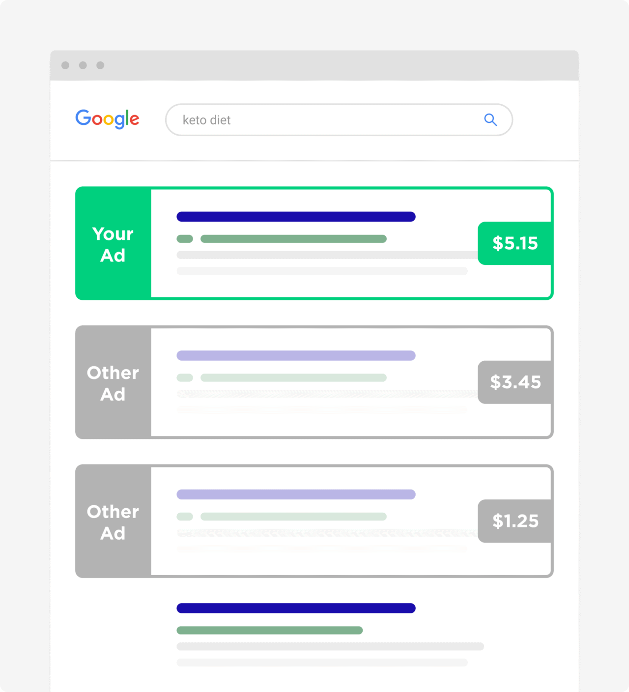 出价:无论您使用 Google Ads 还是 Bing Ads,搜索中的付费广告都与出价有关。使用 PPC,您可以对特定关键字出价。当有人搜索该关键字时,您的广告就会出现。