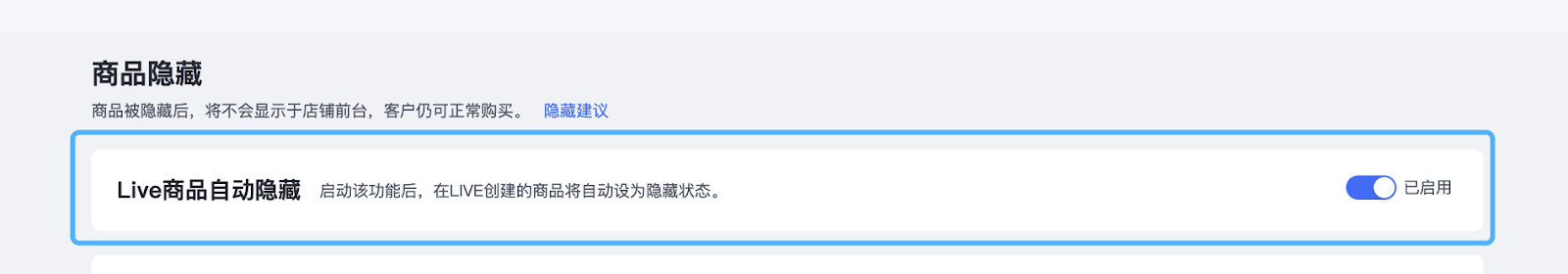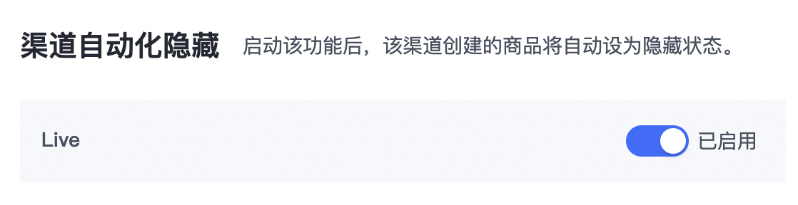 渠道自动化隐藏-Live隐藏:启用之后,直播时创建的商品将被隐藏,不影响店铺商品展示。