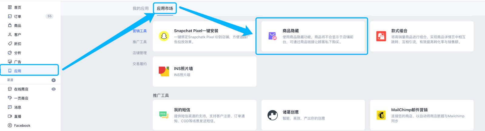 「应用」「应用市场」 >「商品隐藏」进入。