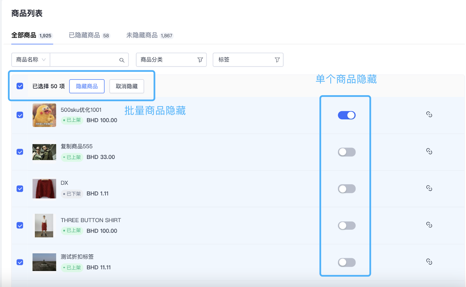 商品管理设置页面:商家可以自由选择批量或单个隐藏商品。
