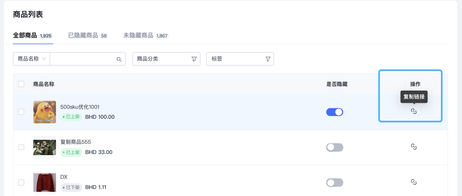 当商品过多时,可以根据商品名称、分类、标签筛选查找所需商品。