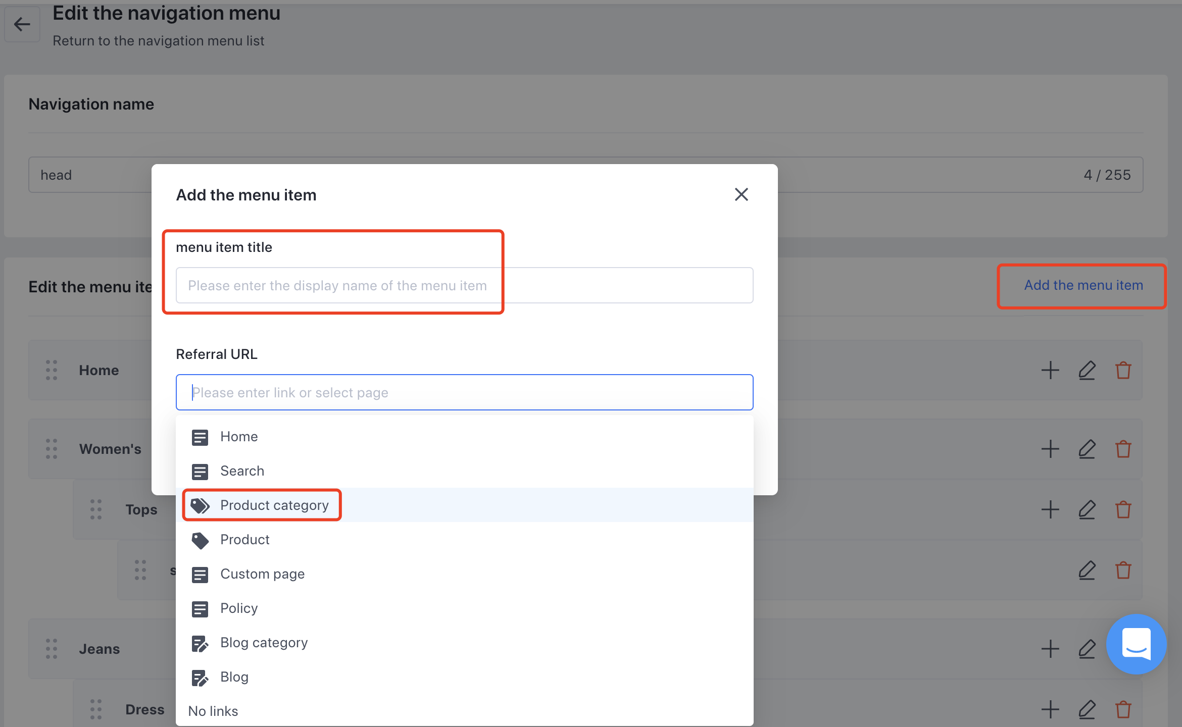 当你进入Main menu后,可以点击添加菜单项板块(add the menu item),可以给新创建的菜单添加链接地址,一般我们要加在网站顶部菜单导航的是网站产品目录,也就是我们前面创建的商品分类(Categories),输入「菜单项名」(menu item title),菜单项名是会让消费者看到的,跳转链接选择商品分类,分类链接选择对应的分类内容。