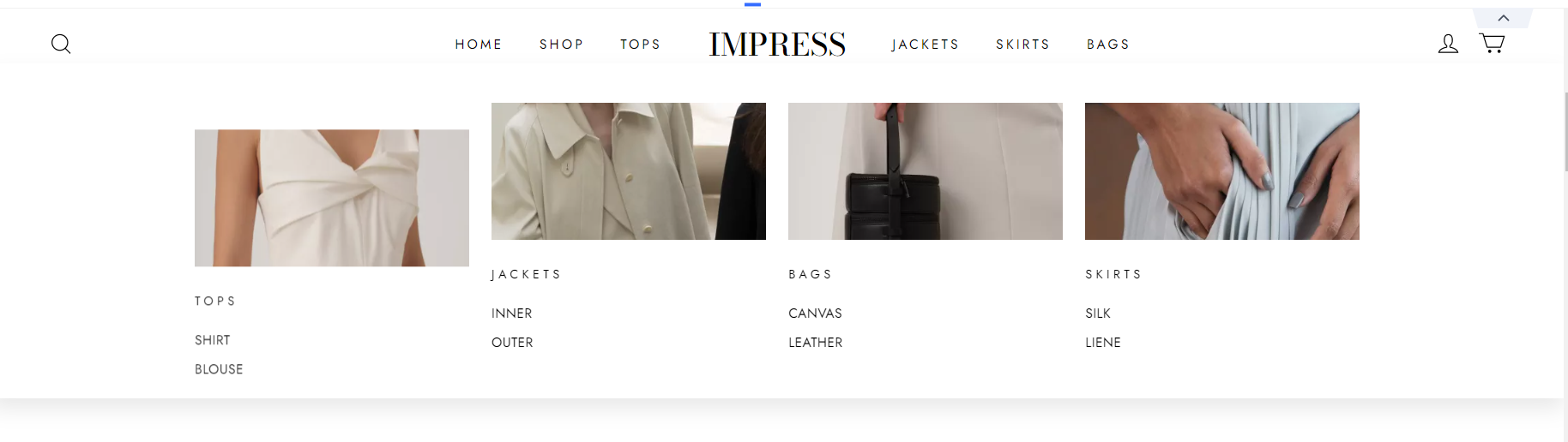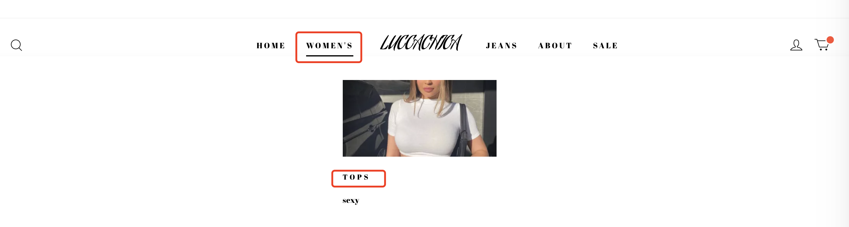 菜单设置好之后保存。打开网站前台,就可以看到如下图所示,在网站的顶部就是我们刚刚添加到Main Menu的菜单项目了。当鼠标移动到顶级菜单Women‘s的时候,就会自动出现下拉菜单选项,展示我们刚刚设置好的二级菜单,比如下图中的tops跟sexy。