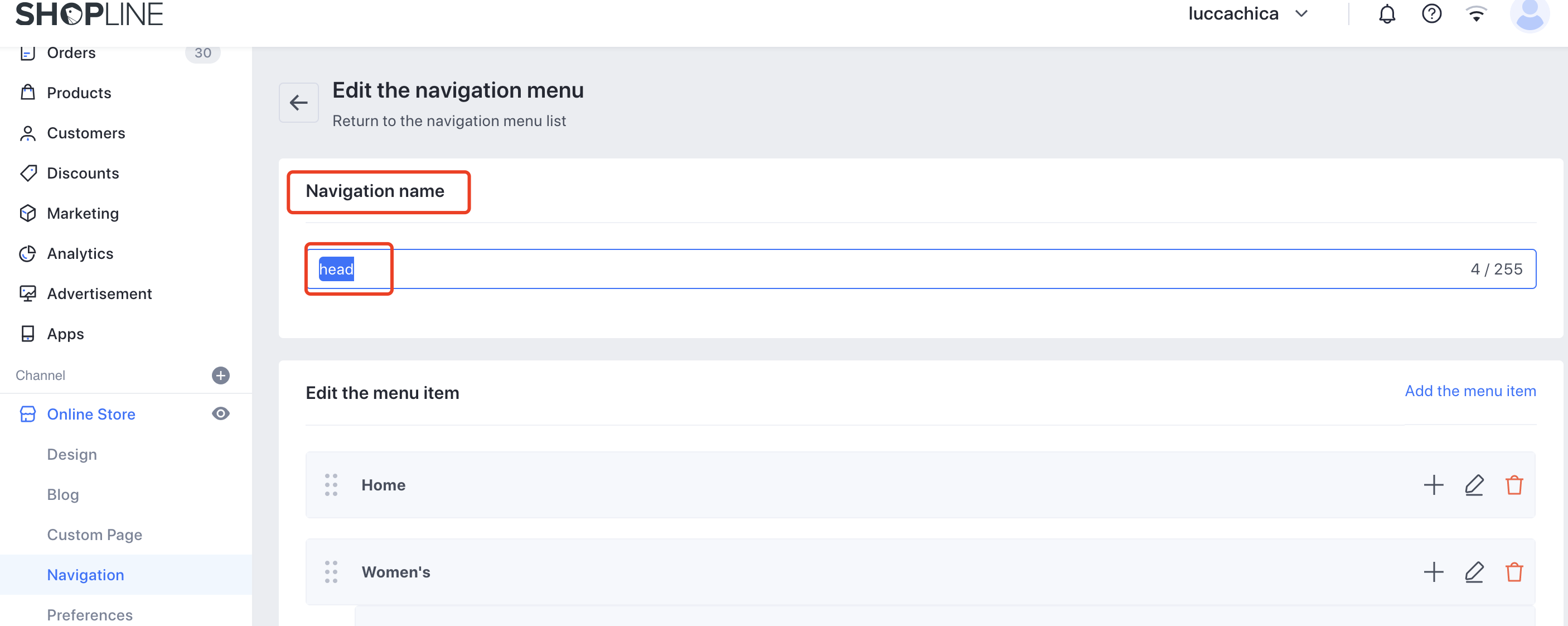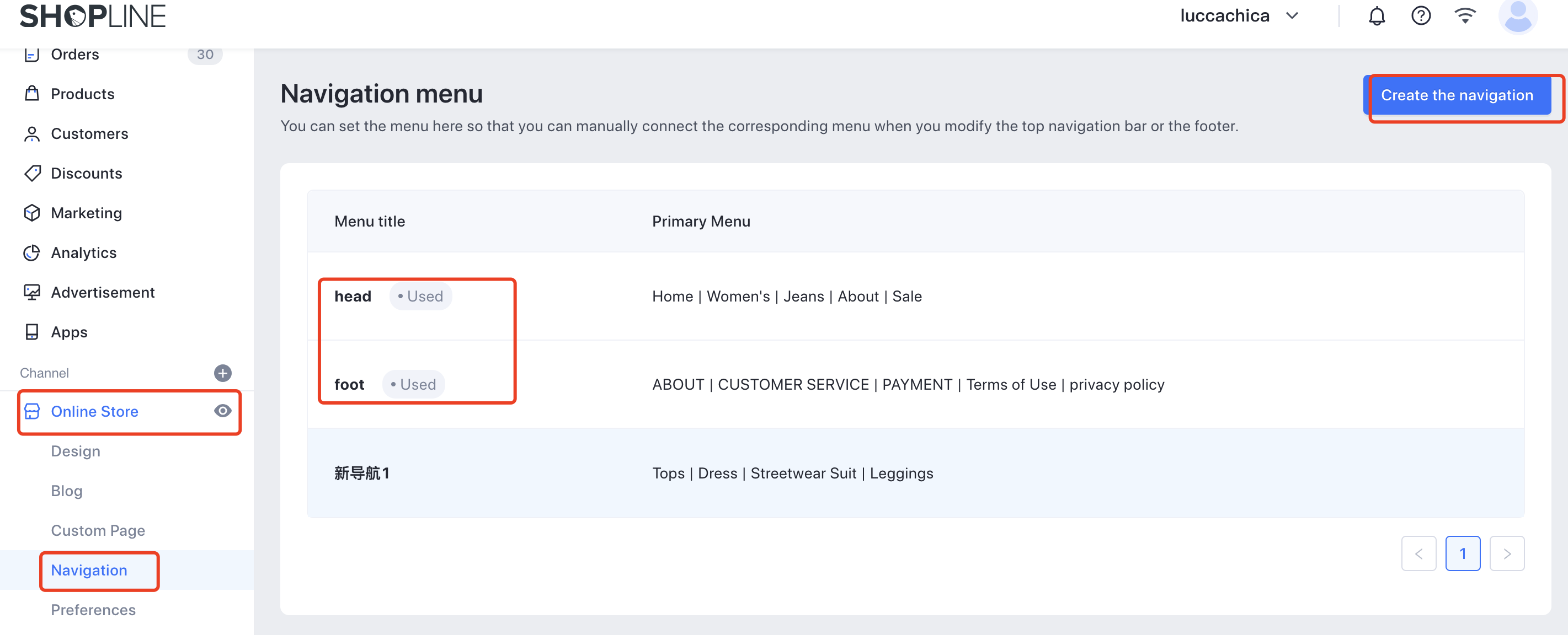 打开Shopline的后台,在自定义页面-菜单导航(Online Store – Navigation)页面,打开Shopline店铺导航设置页面。