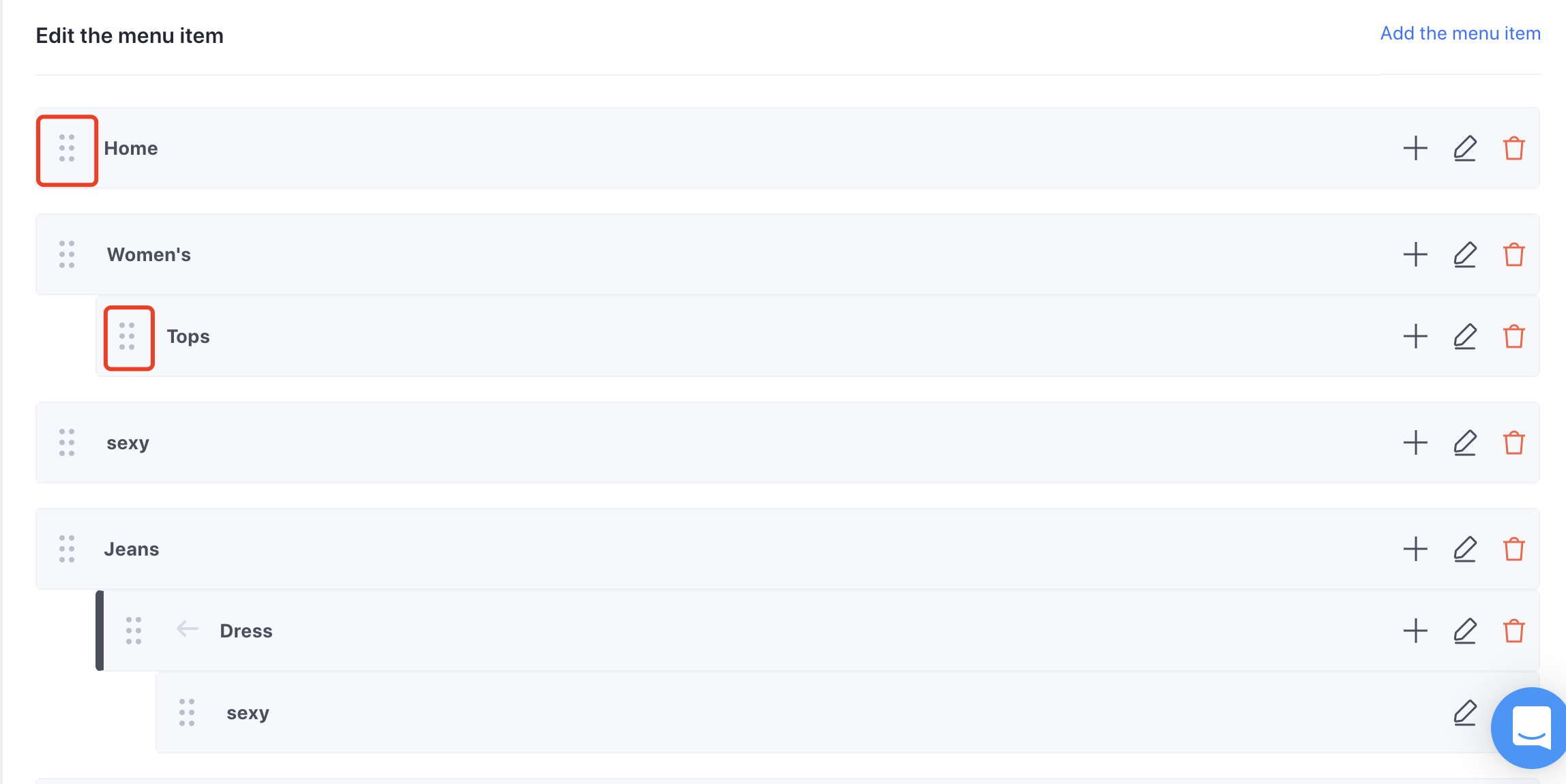 如果在Shopline店铺中创建下拉菜单,或者是二级分类,只需要在下图所示的菜单项目中,鼠标按住并拖动商品分类(Categories)名称前面的6个点的图标进行左右上下拖动,就可以实现下拉菜单的设置。目前Shopline最多支持三级下拉菜单。