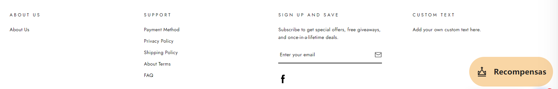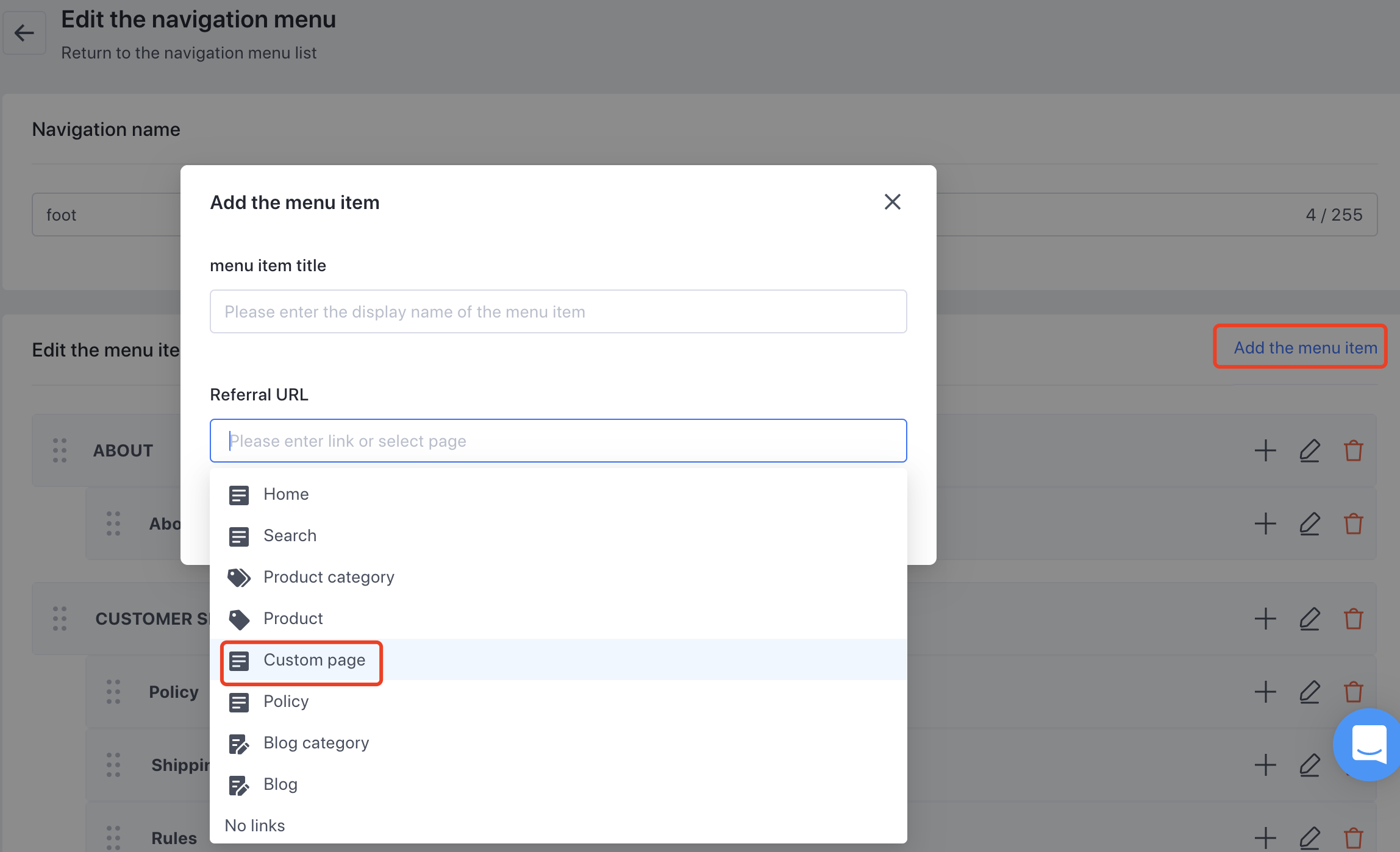 和Main menu的操作流程一样,我们需要把我们之前创建好的自定义页面中的About us,Contact us等等页面添加到网站的底部。同样进入到Footer 的菜单项目添加页面之后,点击添加菜单项(add the menu items)按钮,在弹窗中选择自定义页面(custom page),然后将你之前创建好的页面依次添加到菜单中。