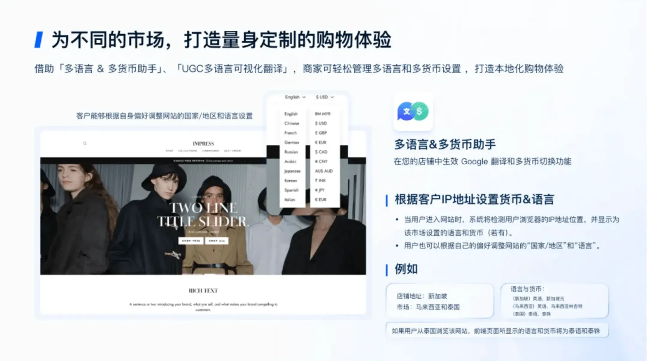 传统多域名多站点模式容易导致流量碎片化,用户体验割裂,并造成运营重负。SHOPLINE的多市场解决方案助商家在同一个站点内,帮助卖家识别、设置、推出、优化和管理国际市场,轻松管理多语言和多货币设置,以更加本地化的方式(国际域名,多语言、多币种)进行销售,提高各国市场的交易转化率,实现一店卖全球。