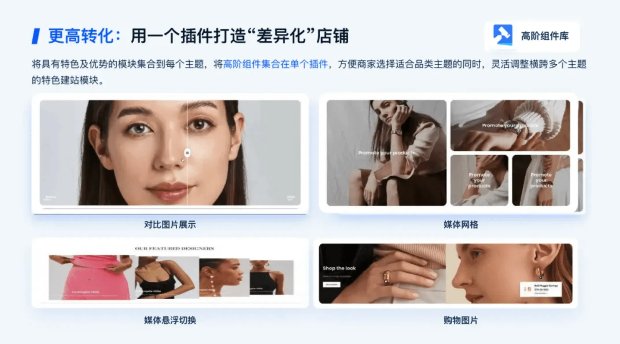 相比行业友商主题模块配置受限,SHOPLINE为商家提供「高阶组件库」,将特色与优势模块集合于单一插件。iFLYTEK灵活选用并跨主题组合多样建站模块,实现真正的个性化与差异化装修。