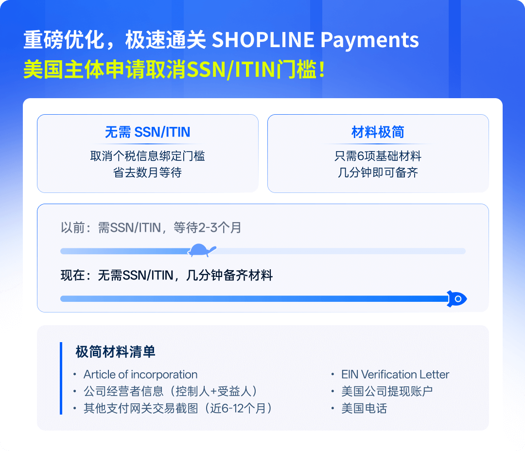 为帮助美国主体商家快速抢占市场,提升开户效率,SHOPLINE Payments 对美国市场开户流程进行了关键升级,全面取消 SSN / ITIN 个税信息要求,将原本需等待 2–3 个月的材料准备过程缩短至只需几分钟: