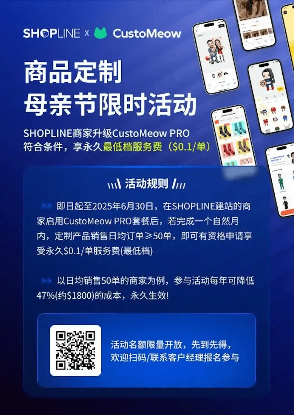 正值母亲节前夕,SHOPLINE联合定制喵CustoMeow面向商家发送独家限时活动: