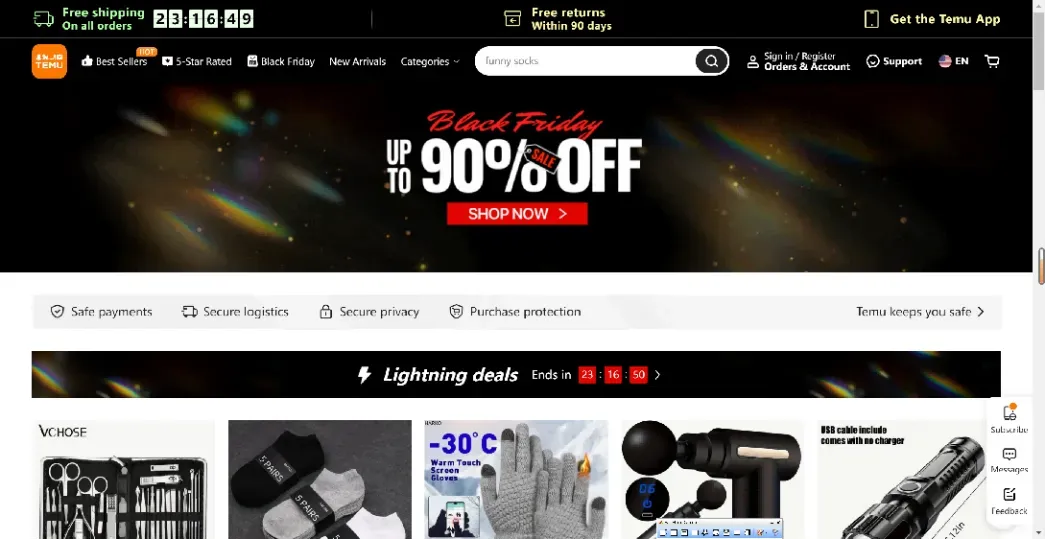 在最近的“黑五”大促中,作为低价“卷王”,Temu从10月20日开始率先开启了为期42天的“黑五抢先购”活动,包括“黑五抢先购、家居、数码、潮流品类日、狂欢节”等多轮大促。这一系列活动为Temu带来了大量新用户和关注,数据显示其美国用户数量已突破1亿,成为短短一年内取得的巨大成功。高盛分析师Eric Sheridan指出,截至今年二季度末,Temu全球下载量超过1.2亿次,成功跻身全球应用下载榜前十。