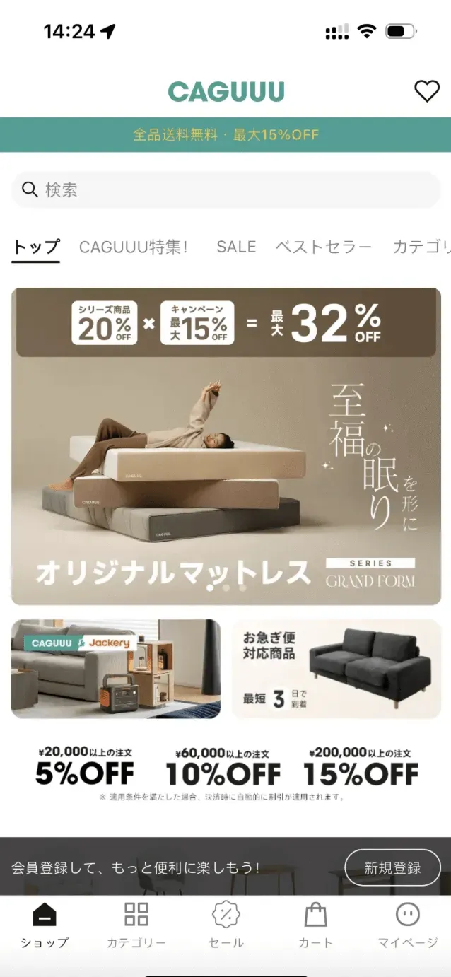 在进入日本市场之初,卡谷就选择了“独立站+App”双平台并行的发展模式。然而,随着业务规模迅速扩大,原有App方案的短板也逐渐暴露出来。卡谷最初的App基于某知名独立站平台的第三方插件搭建,导致结账流程无法内嵌,用户即使已在App加购下单,结账时仍需二次登录,极大影响了体验,高潜力客户因此频繁流失。同时,前端定制能力有限,让卡谷在App设计优化和运营策略上的施展空间受限。
