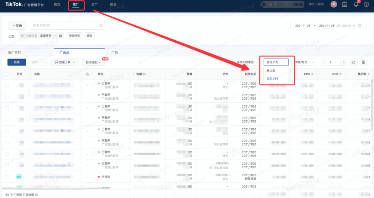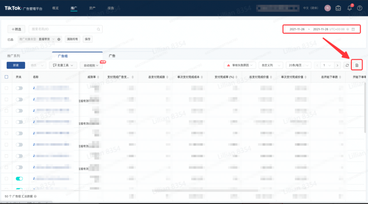 导出报表,在账户推广面板-自定义这里->打开对应的指标,点击确认->选择正确的时间周期->再点击导出按钮即可