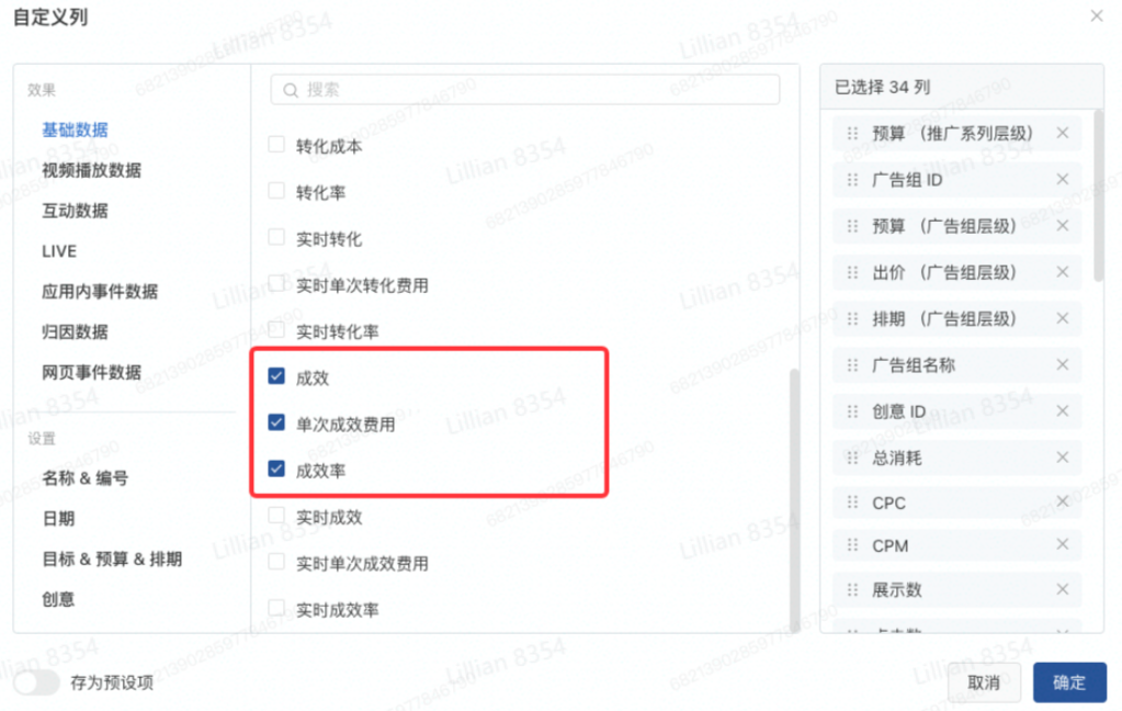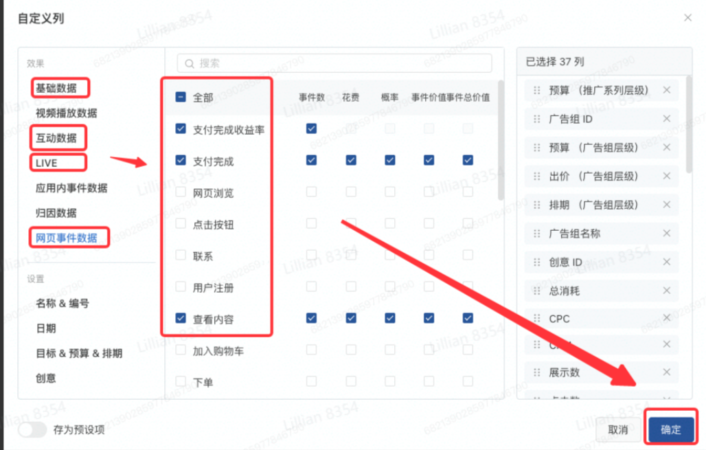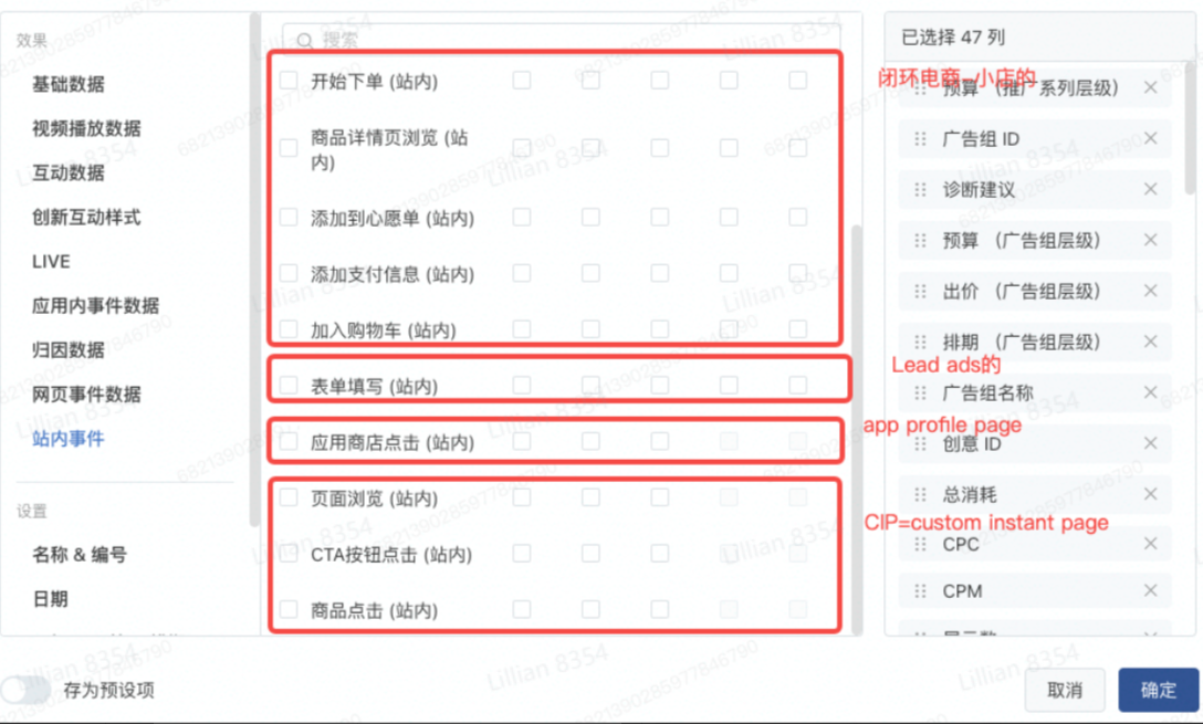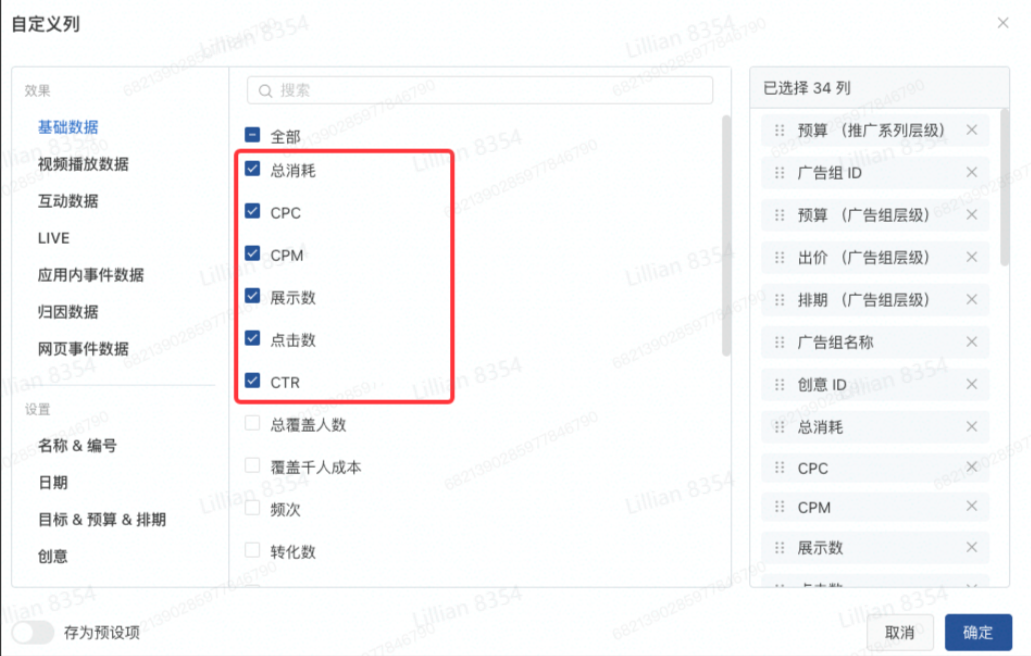 建议导出时勾选以下指标(PS:并非所有的指标都对应有数据,视具体投放情况决定)