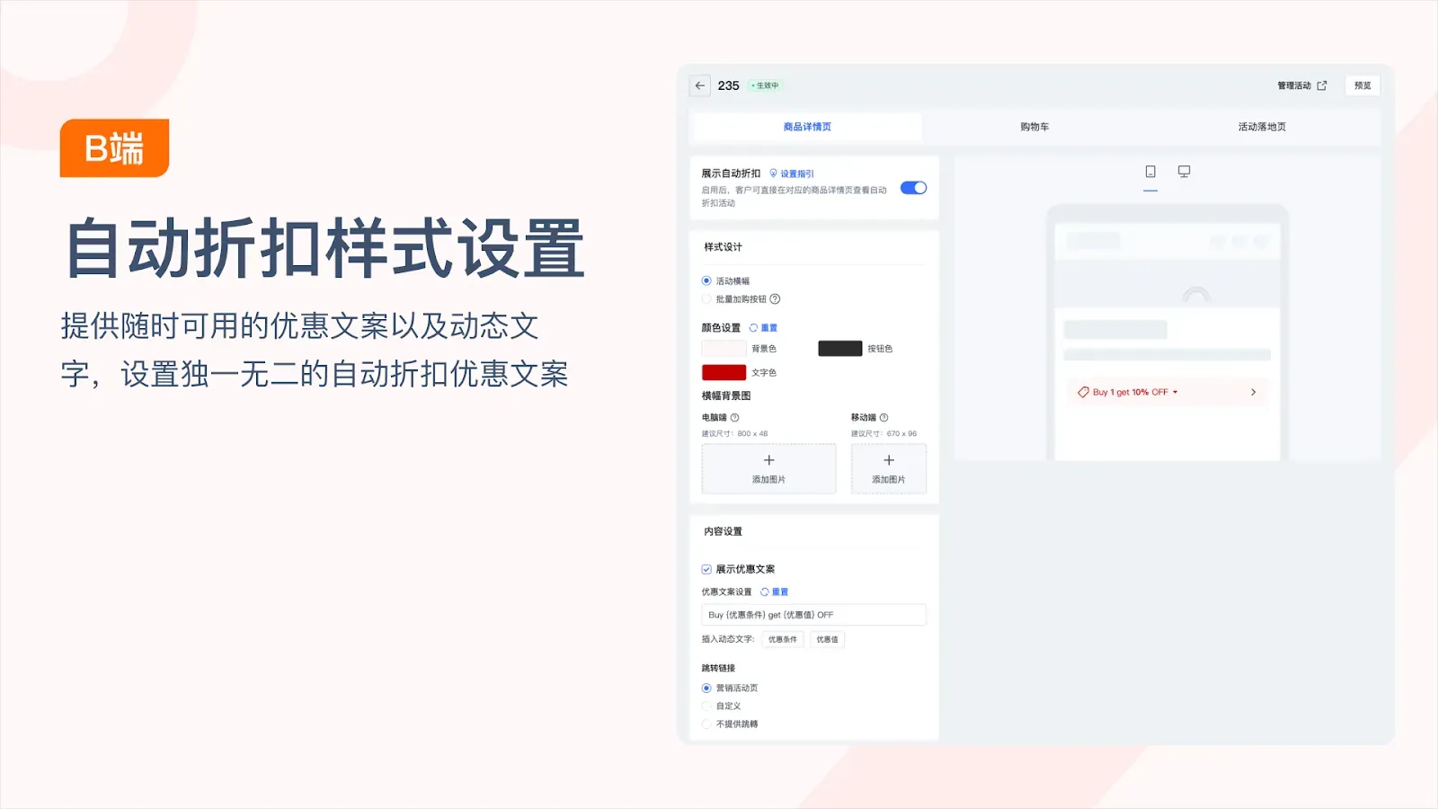设置吸引人的特别活动和折扣是吸引消费者关注和促进销售的有效手段。商家可以通过设置独特的折扣码或专属优惠,引导用户从TikTok跳转到独立站完成购买。同时,利用SHOPLINE的折扣活动设计提供折扣活动自定义样式模版,帮助店铺内折扣活动更加个性、品牌化,吸引客户参与活动,提示当前可以享受的优惠,进一步提升用户的购买体验,帮助提升店铺转化。