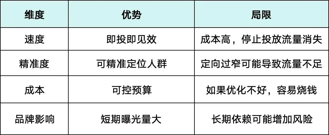 最佳做法:前期依靠付费流量打开局面,后期通过SEO、社交媒体沉淀免费流量,最终形成 付费+免费结合的健康流量池。