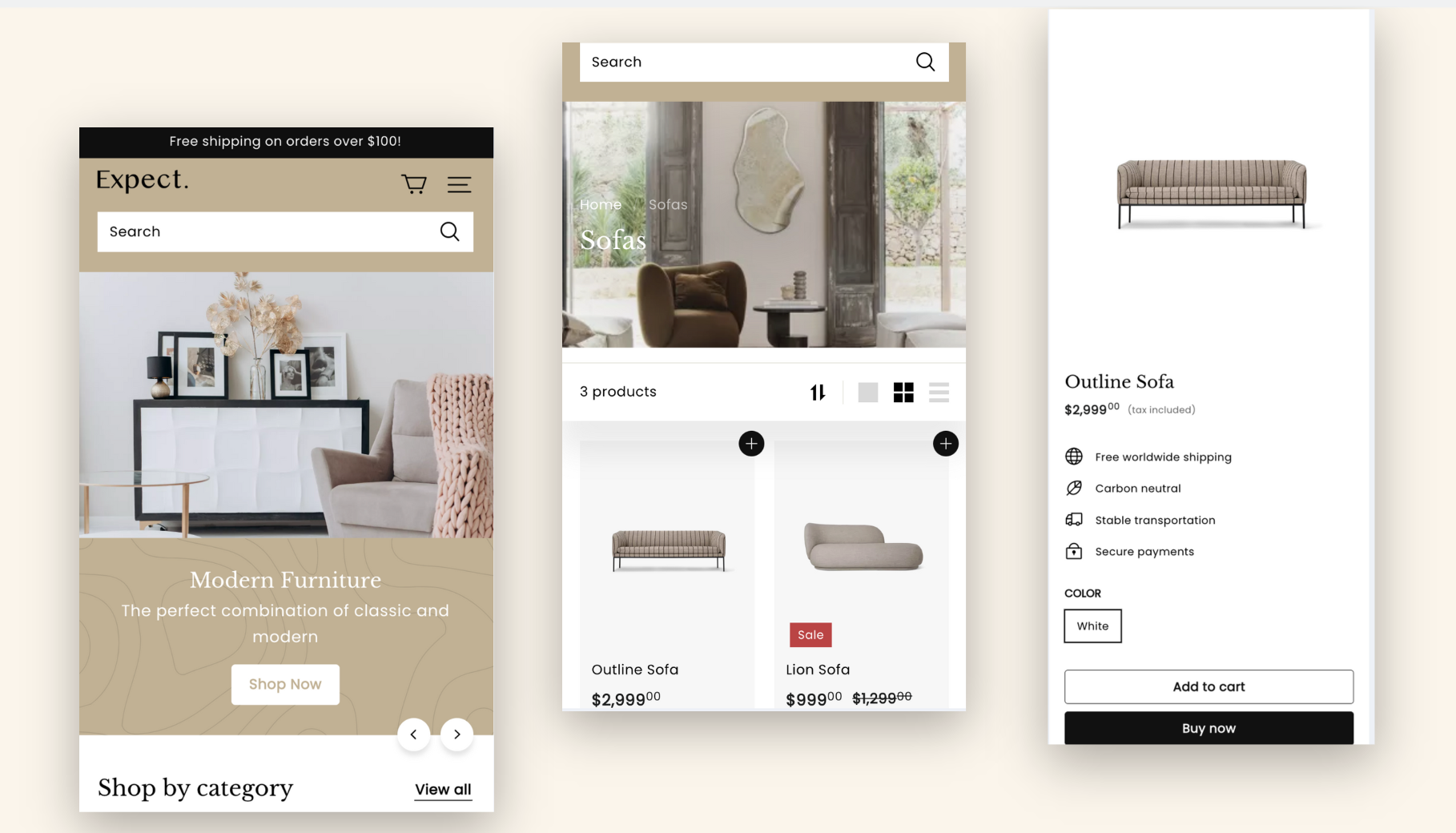 我们有意识地尝试使 Except 尽可能 易于定制 ,以便通过切换一些设置,您可以获得差异化且具有专业外观的在线商店。这在 Expect 中表现出来的一种方式是通过我们协调的调色板。