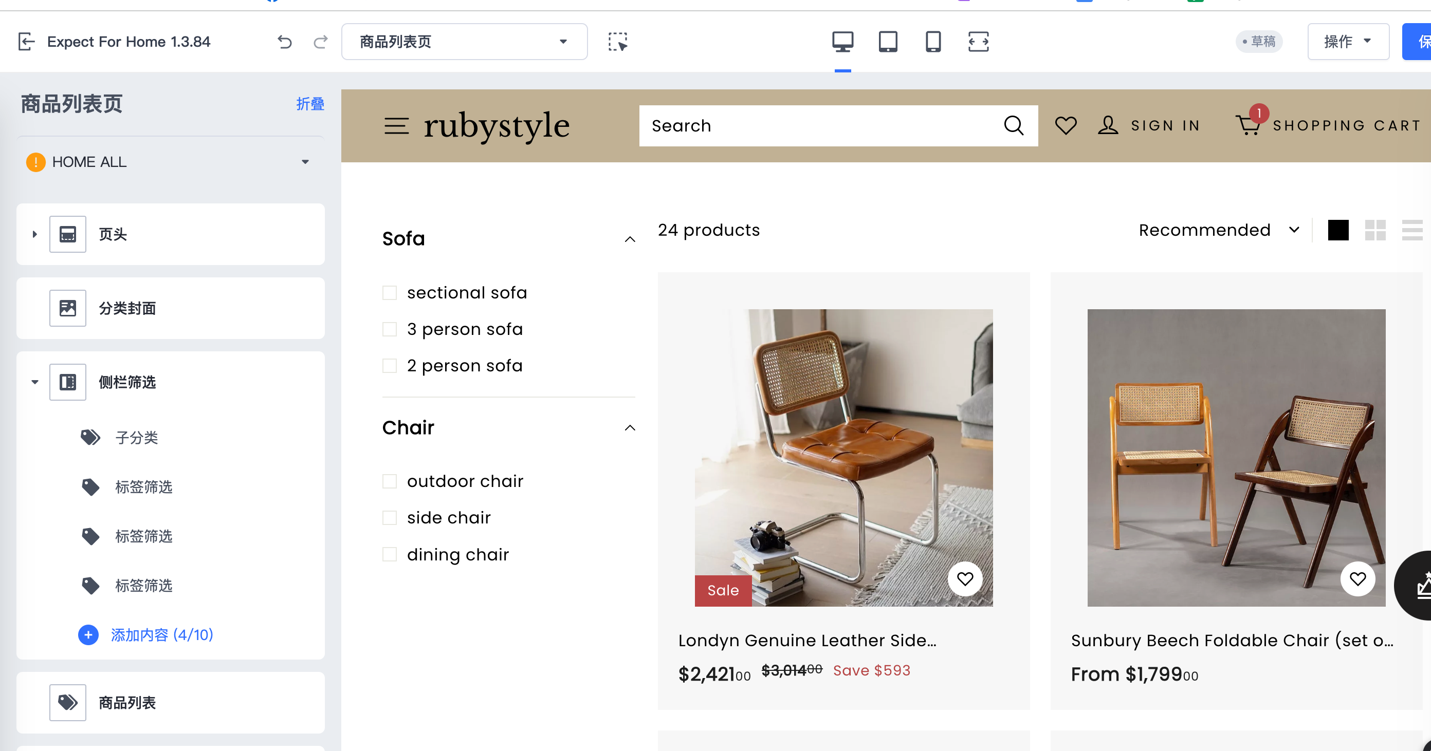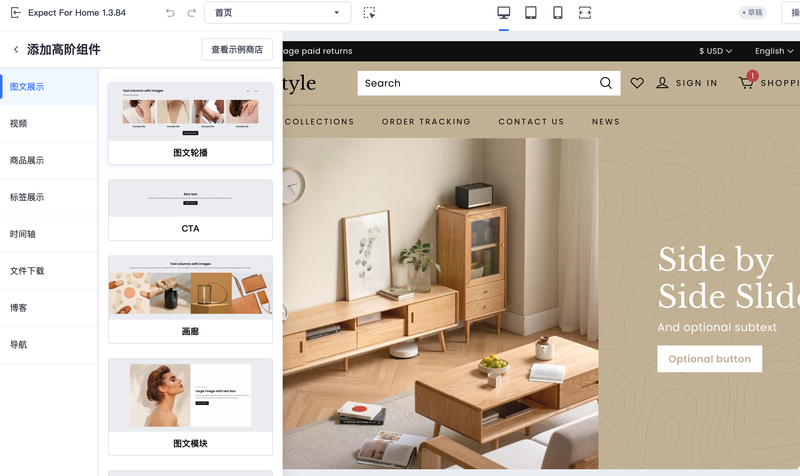 Expect 支持针对不同页面设计不同模板并支持设计首页时高阶组件库的各种组件嵌入,它允许您针对不同的商品列表页、商品详情页呈现不同的内容组件自定义组合设计。