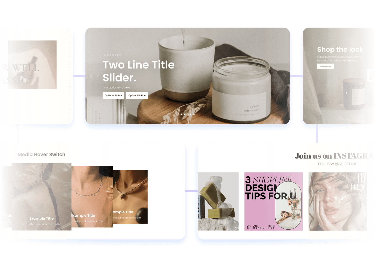 SHOPLINE 高阶组件库提供丰富的预设效果,支持您像“拼图”一样自由组合内容,为独立站商品打造最佳的视觉呈现效果